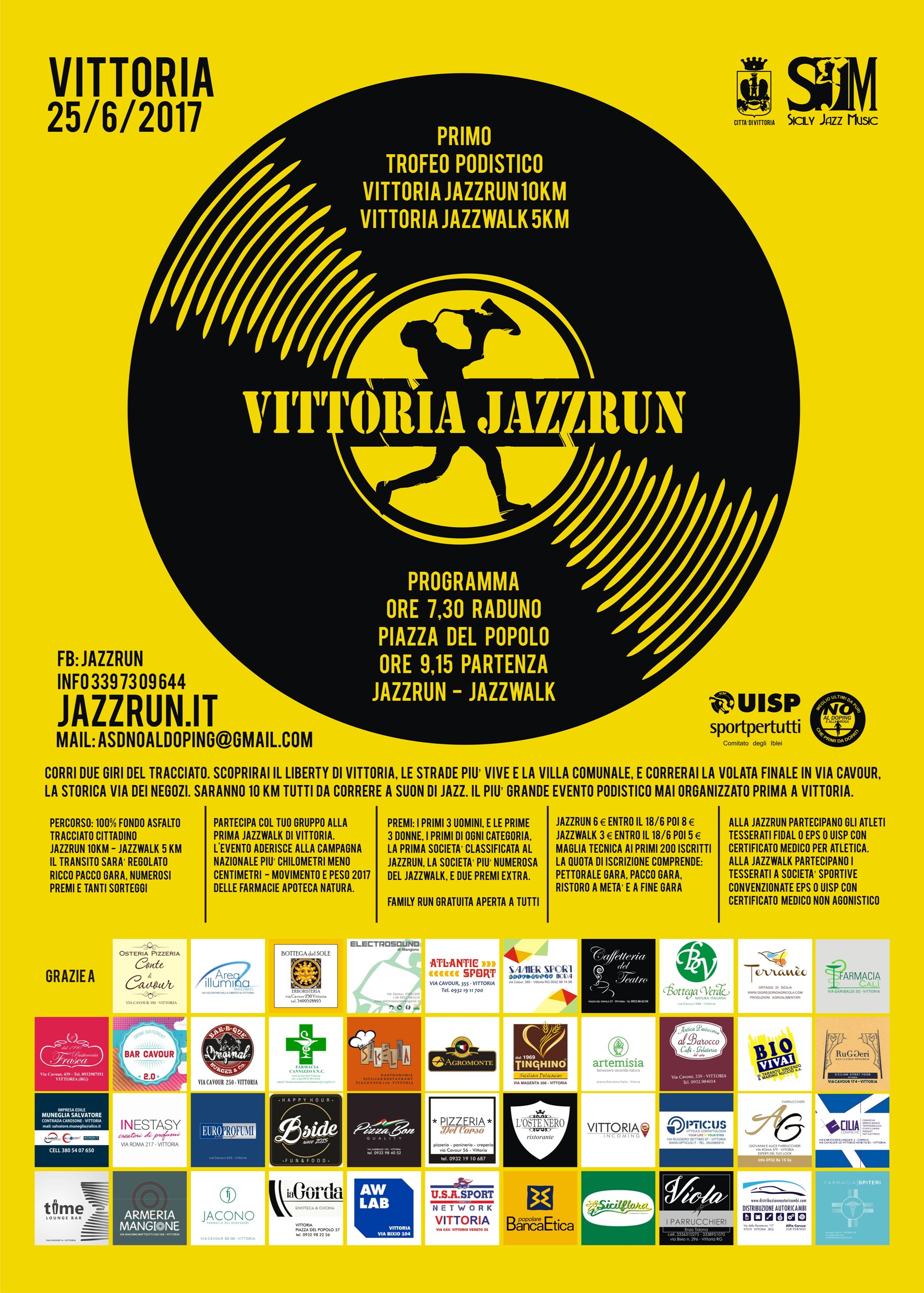 Le associazioni No al Doping e alla Droga di Ragusa, Uisp comitato degli Iblei, col patrocinio del Comune di Vittoria organizzano domenica 25 giugno 2017 la 1^ edizione della JAZZ RUN, iniziativa podistica con lo status principale di “non-competitiva” sulla distanza di 10 km, un fitwalking sulla distanza di 5 km e una family run aperta a tutti e gratuita. L’evento é finalizzato alla promozione tuiristica e culturale della città di Vittoria nell’ambito delle iniziative legate al Vittoria Jazz Festival, Music & Cerasuolo Wines.