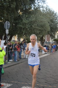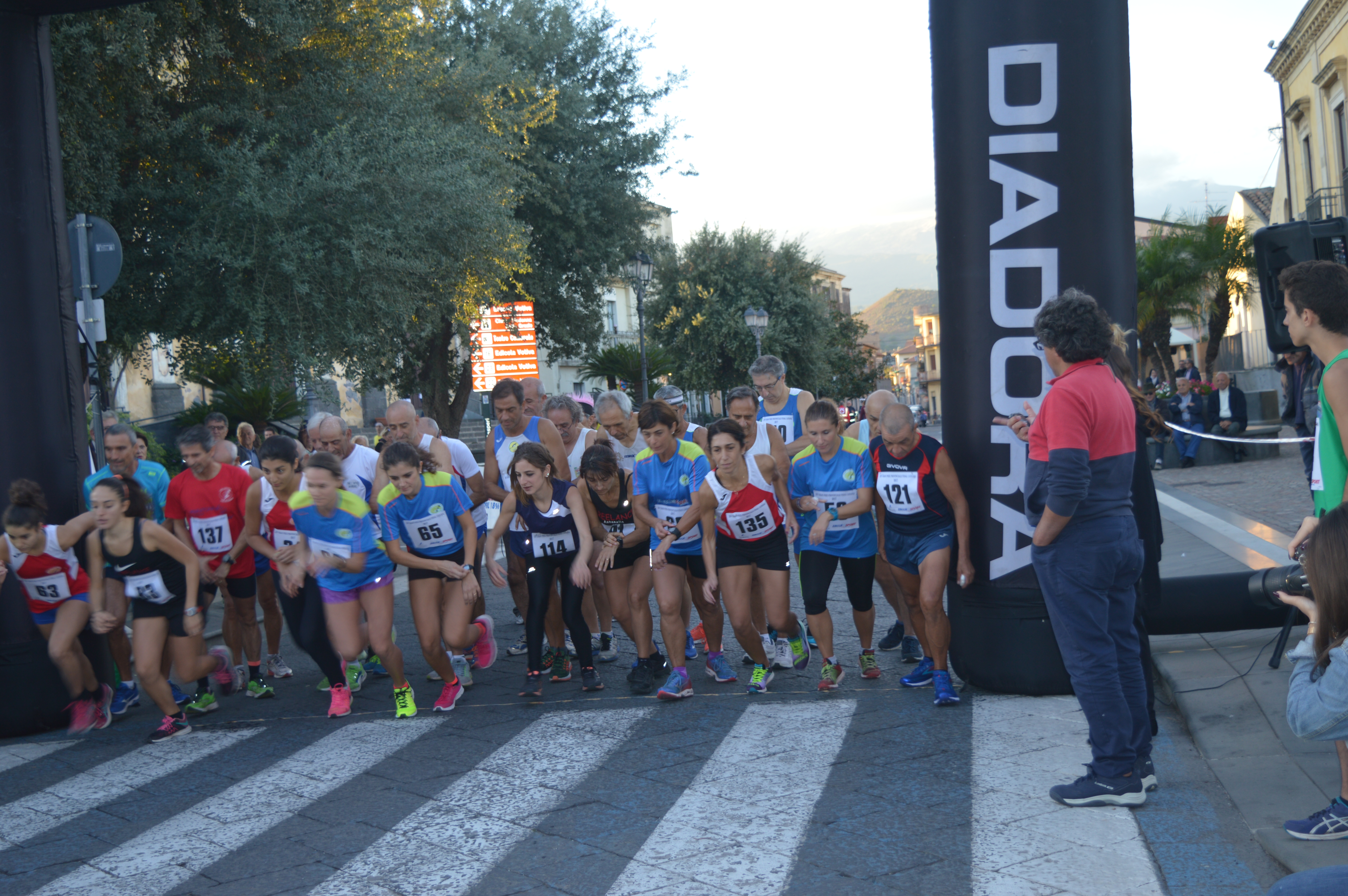 La partenza è velocissima, il più “titolato” tra noi master, Gianfranco Belluomo, infatti imprime subito alla corsa un ritmo proibitivo per tutti gli altri. Gli fa compagnia Alice Leonardi e con un poco di “presuntuoso coraggio” Francesco Novello. Io arranco sulla scia di Ferdinando Schiavino che a suo volta sfrutta il ritmo di Antonio Zingali. Si parte in piano, un fastidioso basolato che sarebbe da rifare. Alla prima svolta si passa sull’asfalto e il fondo al lungo rettilineo vediamo che la strada si impenna fortemente. Abbiamo un centinaio di metri per abituarci all’idea e preparare le gambe. Ferdinando ha nel “mirino“ Novello ma il suo passo è micidiale; appena inizia la salita, nonostante non sia da poco, tiene il ritmo della coppia Belluomo – Leonardi. Alla successiva svolta la strada sale ancora ma più lievemente, io sono sempre l’ombra di Ferdinando. Quando la strada finalmente inizia a discendere Ferdinando, al pari di un “Kamikaze” podistico si lancia senza paura, io alle sue spalle devo fare altrettanto. Un’inversione a “U” ci riporta sul rettilineo di arrivo e il passaggio sotto il gonfiabile scandisce il primo giro. Quando affrontiamo per la seconda volta “l’erta”, Belluomo decide di lasciare la compagnia di Alice e Francesco. Io sono sempre “a rimorchio” di Schiavino che nella discesa forza ancora il ritmo. Novello incontrastato numero uno della SM60 non è assolutamente alla nostra portata. Intanto Ferdinando ha agganciato Antonio Zingale e io mi “sto levando la vita” per stargli appresso. Il terzo e ultimo giro stabilisce definitivamente i valori degli atleti in gara: io sull’ultima salita perdo leggermente il contatto dalla coppia Zingale – Schiavino. Belluomo privo di avversari si aggiudica la batteria e la categoria SM55, mentre Alice è incontrastata leader tra le rappresentanti “dell’altra metà del cielo” e precede sulla linea del traguardo Francesco Novello. Zingale con un finale deciso lascia la nostra compagnia e Ferdinando mi precede sotto il gonfiabile di un “pugno” di secondi.