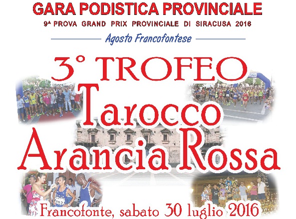 L’Atletica Scuola Lentini rinnova l’invito a tutti gli atleti siciliani a partecipare al 3° Trofeo Podistico “Tarocco Arancia Rossa”, valevole come 9^ prova dell’11° Grand Prix Provinciale di Siracusa di corsa su strada e su pista 2016. Appuntamento per sabato 30 luglio con ritrovo in piazza Dante, Francofonte (Sr) dalle ore 17. La gara che si disputerà su un circuito cittadino di 1300m (da ripetersi più volte a seconda delle categorie di appartenenza) vedrà la presenza del folto gruppo di amatori che si contendono la vittoria nella classifica finale dell’undicesimo campionato provinciale. Saranno inoltre previste le batterie di apertura con la partecipazione delle categorie giovanili.