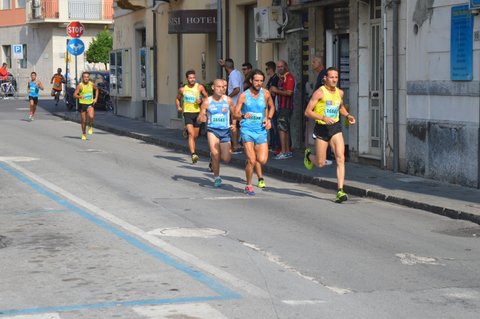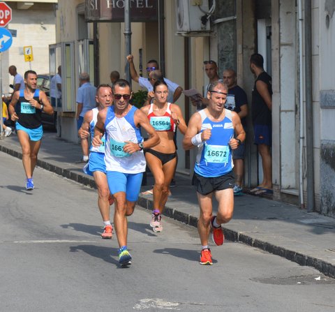 La strada è abbastanza larga, c’è comunque qualche “scivolone”, fortunatamente senza conseguenze per nessun podista. Siamo sul lungomare, gettiamo lo sguardo a destra, sul bel mare della riviera di levante, ma la raffineria che con le sue colonne di distillazione si erge di fronte alla città non dà una bella sensazione e preferisco concentrarmi sulla gara. Ho subito la compagnia della bella Liliana Canzonieri, ma il suo passo, al solito è leggermente più veloce del mio e la sua compagnia dura ben poco. Il tracciato continua a costeggiare il mare, aspetto con ansia la boa che ci darà il segnale forse del mezzo giro completato. Vedo arrivare in senso contrario i battistrada della gara, c’è un gruppo di almeno sei o sette elementi tra i quali distinguo Vito Massimo Catania (Atl. Regalbuto) e Lorenzo Abbate (Universitas Pa). Capisco che la boa si avvicina, finalmente la vedo, la raggiungo, faccio l’inversione senza perdere il ritmo, ancora sono nel pieno delle energie. Sono tallonato da Salvatore Irato, SM60 come me, atleta della società organizzatrice, che non vuole sicuramente sfigurare, proseguiamo fianco a fianco. Il percorso lascia il lungomare, entriamo in una isola pedonale delimitata da alcuni pericolosi birilli inamovibili, ma l’organizzazione è perfetta: alcuni volontari avvisano dell’ostacolo gli atleti che mano a mano sopraggiungono. Finisce l’isola pedonale, attraversiamo una piazza, poi una doppia svolta a sinistra ci riporta in via Crispi e finisce il primo giro. Sono nuovamente sul lungomare in compagnia di Irato, incrociamo la testa della corsa ridottasi a un quartetto tirato da Catania. Dopo la boa incrocio i miei amici-avversari di categoria Cammarata (Atl. Sicilia) e Ferraro (Atl. Lentini), che mi inseguono a breve distanza. Proseguo con Irato al fianco e penso che “l’imprendibile Tavano”, leader dei sessantenni, a quest’ora avrà avuto anche il tempo per fermarsi al bar per un caffè. Ritorniamo verso il centro, siamo in pieno sole e il caldo comincia a farsi sentire, siamo in riva al mare ma di brezza non se ne parla neppure. Termina il secondo giro, passo dal gonfiabile e l’amico podista Giuseppe Mazzeo, assente per infortunio e oggi spettatore, sportivamente mi incita. Sono sempre in compagnia di Salvatore Irato e capisco che stiamo lottando per i gradini più bassi del podio. A questo punto forse le mie gambe si ricordano che 14 ore prima si sono fatte il 3000 in pista nella “Notturna Misterbianchese” ed “entrano in sciopero”. Il fiato si fa sempre più corto. Il mio avversario progressivamente si allontana non perché acceleri ma perché sono io che rallento. Cerco di rimanere sulla sua scia per conservare il podio; al giro di boa vedo Cammarata e Ferraro, non sono lontanissimi e cerco di “mantenere le distanze”. La temperatura è salita e si soffre, ma stringo i denti, è l’ultimo chilometro, capisco che Irato è irraggiungibile ma anch’io lo sono rispetto a chi mi insegue. La visione del gonfiabile è liberatoria, sono al traguardo.