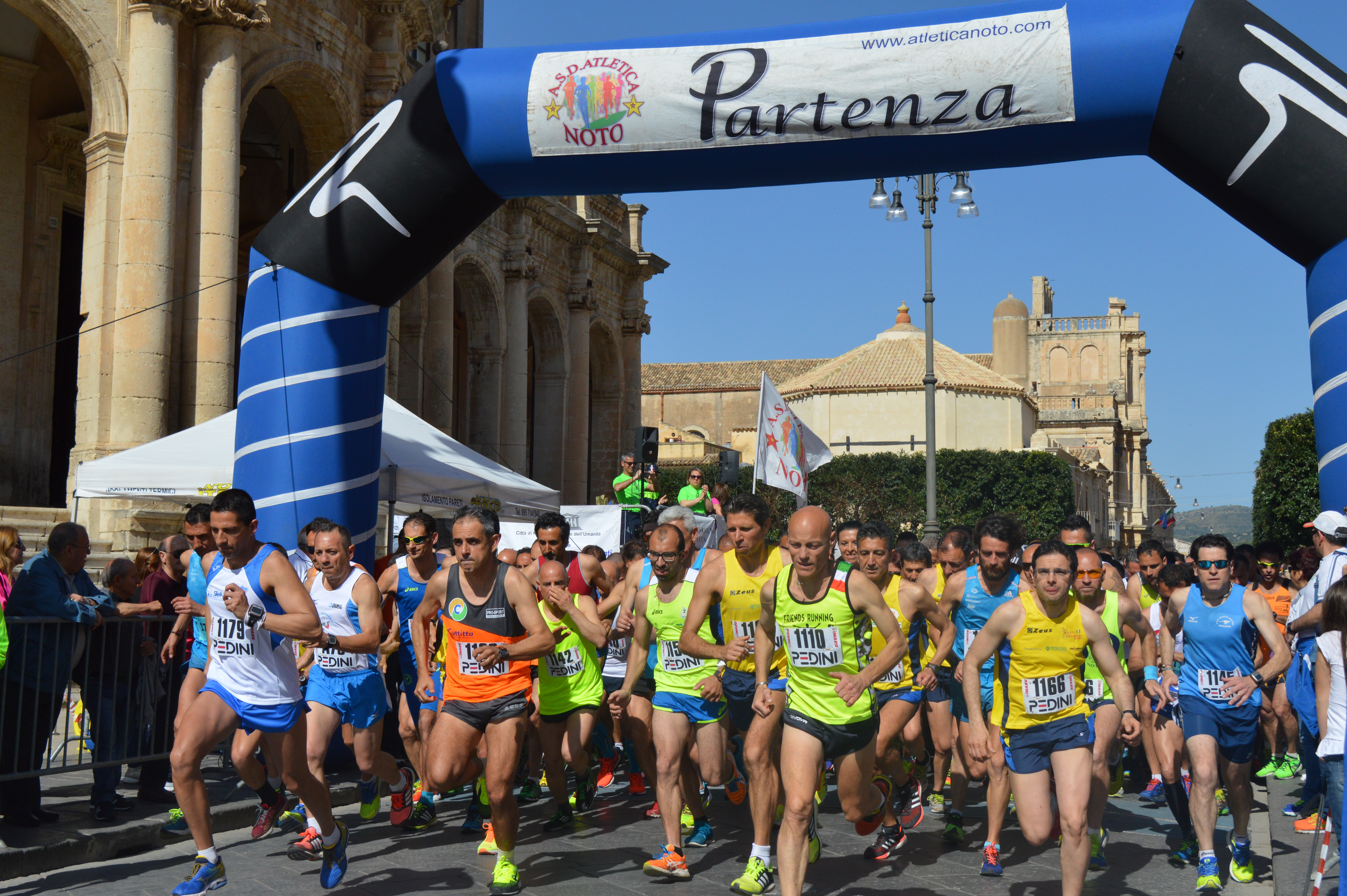 Noto_2016Ore 9. Quando giungo a Noto, la prima “corsa” è quella al parcheggio e io conquisto l’ultimo posto “utile” sul viale dell’arrivo, “ombra compresa”. Mi rendo subito conto che se a Piazza Armerina il 13 Marzo, nel Campionato di Cross, abbiamo trovato il freddo di fine inverno, qui a Noto troviamo il caldo dell’inizio della primavera, quasi un’estate. L’atmosfera è di vera festa: Turisti, Podisti e Ciclisti si stanno riversando in città. I primi ad ammirare il barocco, i secondi e i terzi a misurare le loro forze nelle competizioni sportive. Le foto turistiche di chi ammira la cattedrale splendidamente restaurata si mescolano con quelle del pre-gara degli atleti. La strada di accesso al centro della città vede due gonfiabili contrapposti, il primo per noi podisti che sgambetteremo, di fronte a “Palazzo Ducezio” e il secondo dal lato opposto del corso Vittorio Emanuele, per chi pedalerà. Come “aperitivo riscaldante” scelgo di provare il giro del percorso. È breve, sono solo 1250 metri che ripeteremo tutti, senza distinzione di sesso o età, per 8 volte, per un totale di 10 chilometri. Al termine del giro mi rendo conto che non sarà una “passeggiata” e ci “divertiremo” sicuramente.
