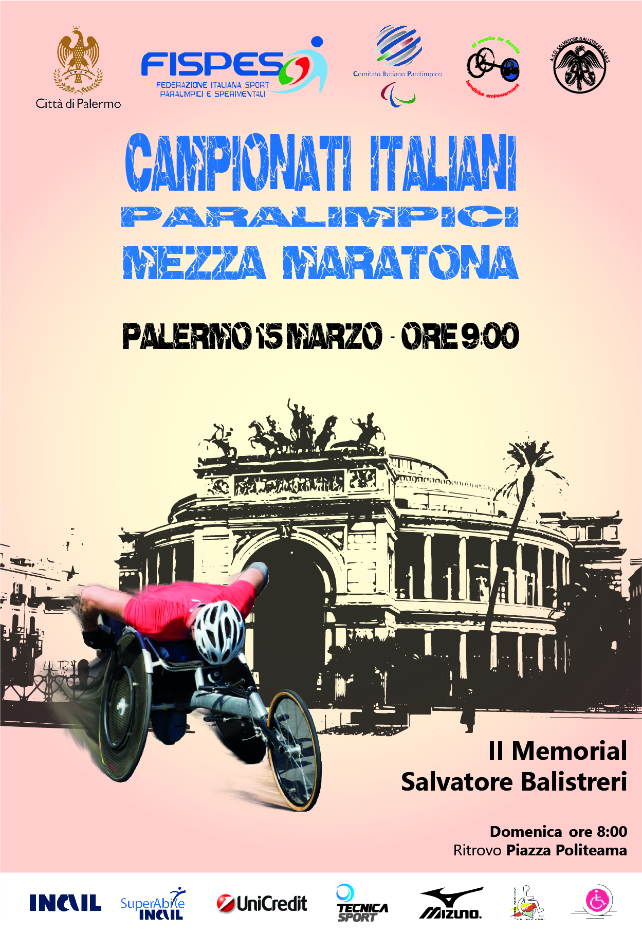 Venerdì 13 marzo 2015 alle 11 presso la sala conferenze “Salvatore Balistreri” di Villa delle Ginestre a Palermo, si terrà la conferenza stampa di presentazione dei Campionati Italiani Paralimpici di Mezza Maratona – “2° Memorial Salvatore Balistreri”, che si svolgeranno nel capoluogo siciliano domenica 15 marzo. La manifestazione è organizzata dall’Associazione Siciliana Medullolesi Spinali Salvatore Balistreri ASD, in collaborazione con l’ ASD Il Vento in Faccia Handbike Empowerment e la FISPES Comitato Regionale Sicilia. Nel corso dell’incontro sarà illustrato il percorso di gara, svelata la start-list e reso noto il programma della manifestazione. Saranno presenti, tra gli altri, l’Assessore allo sport del Comune di Palermo Cesare La Piana, il Presidente dell’ASMS Salvatore Balistreri ASD, Mario Balistreri, Rachid Berradi, ex atleta e animatore dell’associazione Libera, i responsabili dell’Associazione Ballarò e Salvo Campanella (ASD Vento in Faccia) in rappresentanza degli atleti in gara.