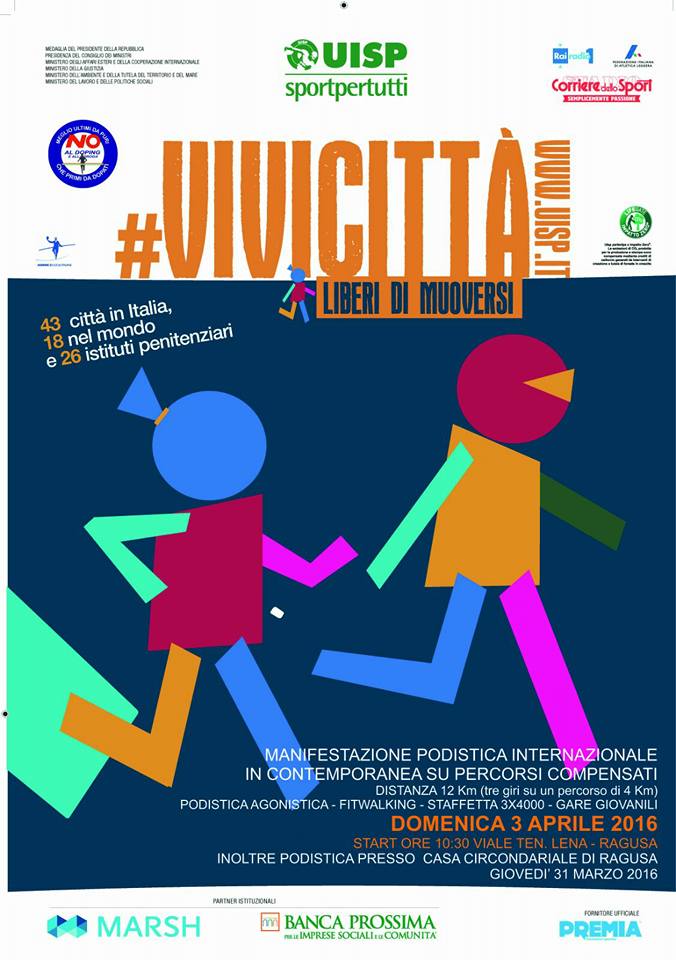 Slogan dell’ evento ” Liberi di Muoversi” per una Città più sostenibile con meno traffico e meno smog, organizzazione curata da UISP territoriale, Asd No al Doping, Cives l’Infermieri per l’emergenza, Patrocinata dal Comune di Ragusa Assessorato allo Sport.